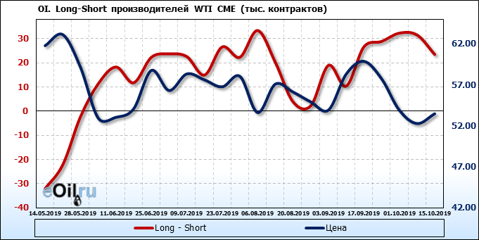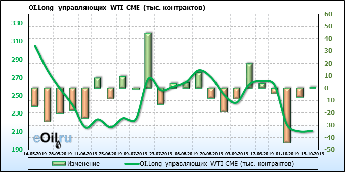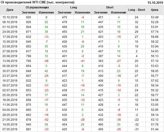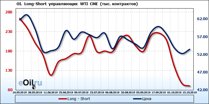 За прошлую неделю, 09.10.19 — 15.10.19, разница между длинными и короткими позициями управляющих упала на 7 тыс. контрактов. В тоже время, цена выросла на 1.2 доллара. Управляющие не горят желанием покупать, что заставляет нас рассуждать о потери доверия к тенденции со стороны быков — спекулянтов. Рынок становится более тонким. Без прихода свежих объемов, толкать цену вверх скоро будет некому.