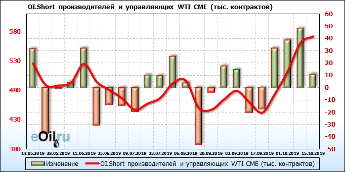 За прошлую неделю, 09.10.19 — 15.10.19, разница между длинными и короткими позициями производителей упала на 8 тыс. контрактов. В тоже время, цена выросла на 1.2 доллара. Производители увеличивают продажи, предполагая, что текущие уровни являются привлекательными для них. И не смотря на это, рынок продолжает расти, что показывает силу текущего тренда.