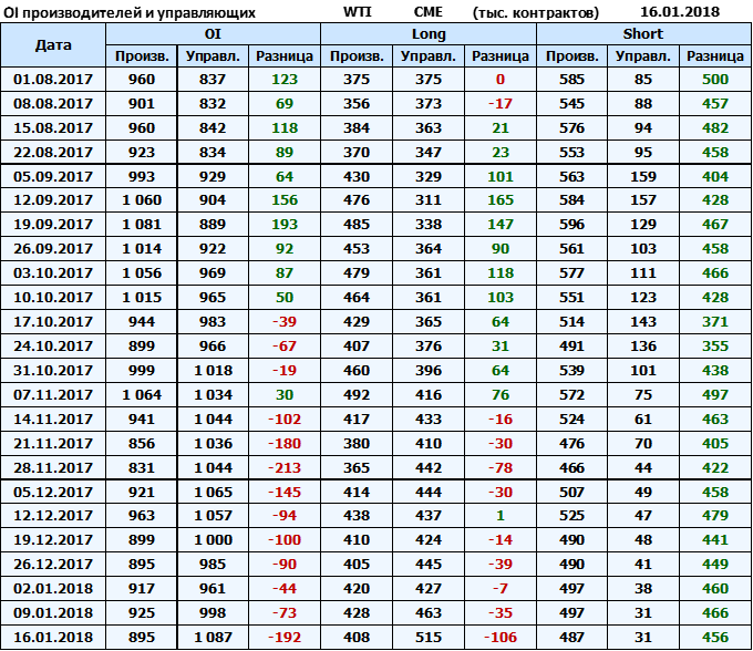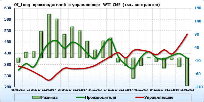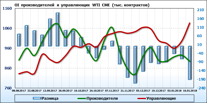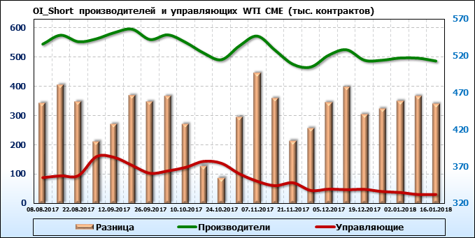 За прошедшую неделю разница между OI производителей и OI управляющих сократилась на 119 366 контрактов. Разница между длинными позициями производителей и управляющих сократилась на 71 234 контракта. Разница между короткими позициями производителей и управляющих сократилась на 10 061 контракт.