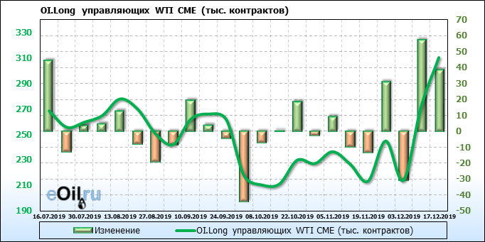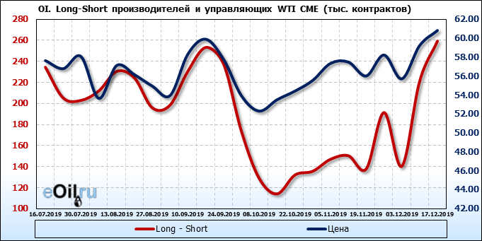За прошлую неделю, 11.12.19 — 17.12.19, разница между длинными и короткими позициями управляющих выросла на 44 тыс. контрактов. В тоже время, цена выросла на 1.59 доллара. Управляющие наращивают позиции, разгоняя тем самым рост цен, что говорит нам о текущей силе рынка.