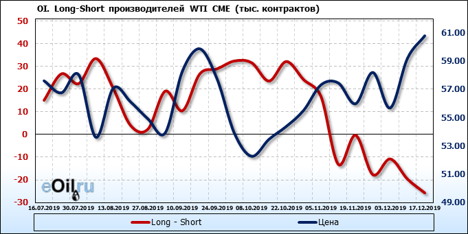 За прошлую неделю, 11.12.19 — 17.12.19, разница между длинными и короткими позициями производителей упала на 6 тыс. контрактов. В тоже время, цена выросла на 1.59 доллара. Производители увеличивают продажи, предполагая, что текущие уровни являются привлекательными для них. И не смотря на это, рынок продолжает расти, что показывает силу текущего тренда.