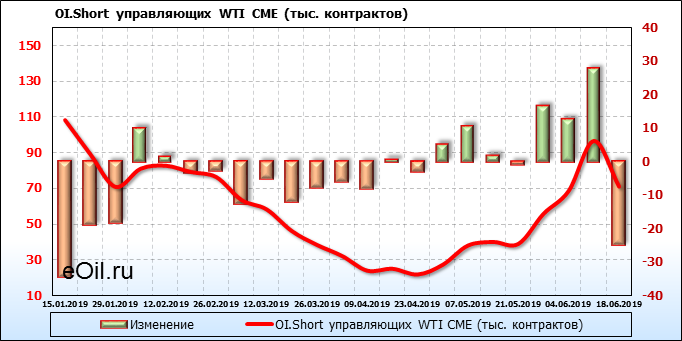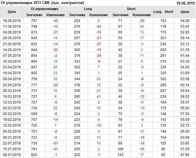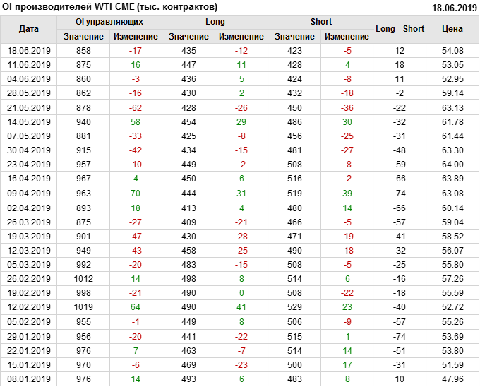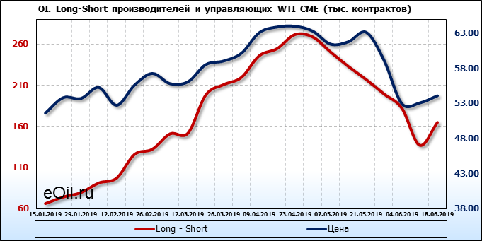 За прошлую неделю, 12.06.19 — 18.06.19, разница между длинными и короткими позициями управляющих выросла на 34 тыс. контрактов. В тоже время, цена выросла на 1.03 доллара. Управляющие наращивают позиции, разгоняя тем самым рост цен, что говорит нам о текущей силе рынка.