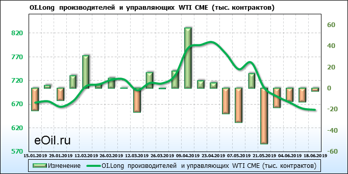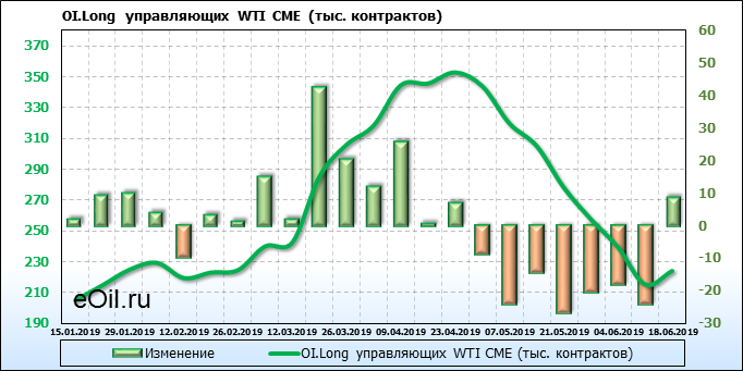 За прошлую неделю, 12.06.19 — 18.06.19, разница между длинными и короткими позициями управляющих выросла на 34 тыс. контрактов. В тоже время, цена выросла на 1.03 доллара. Управляющие наращивают позиции, разгоняя тем самым рост цен, что говорит нам о текущей силе рынка.