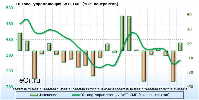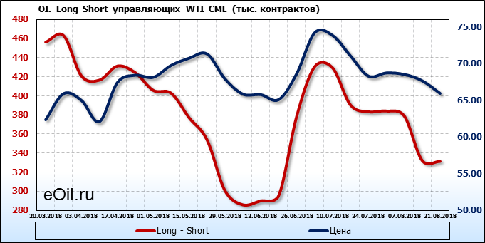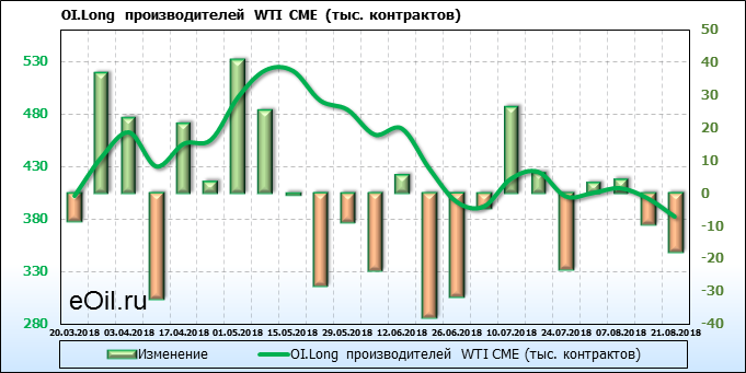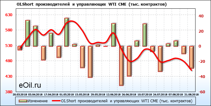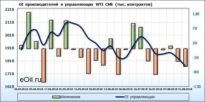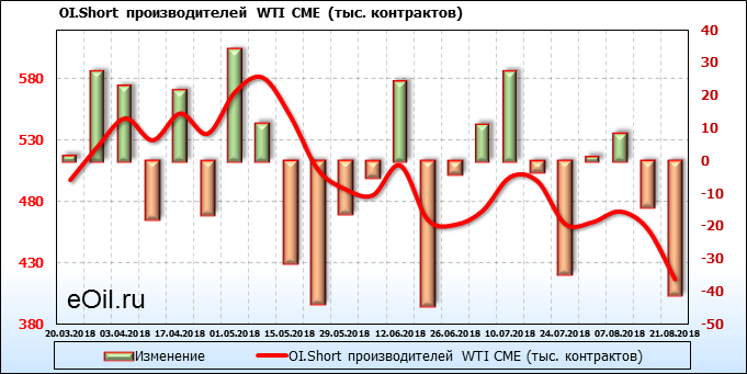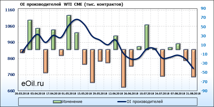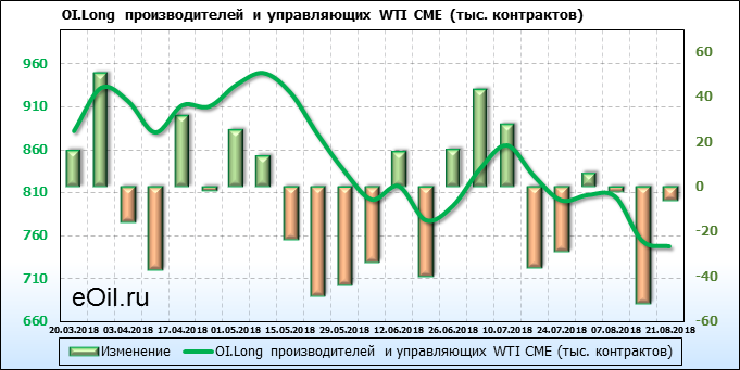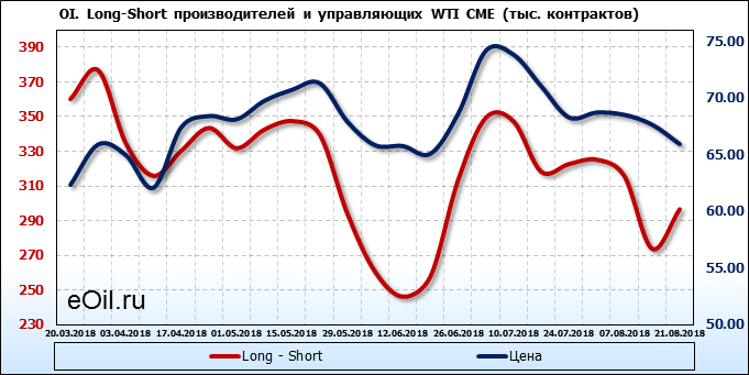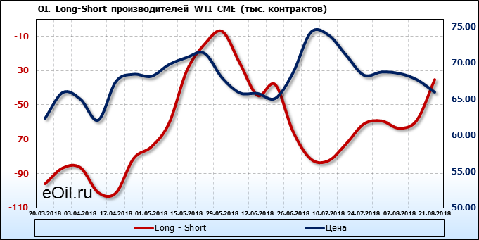За прошлую неделю, 13.08.18 — 17.08.18, разница между длинными и короткими позициями производителей выросла на 24 тыс. контрактов. В тоже время, цена упала на 1.72 доллара. Производители перестали наращивать короткие позиции, что говорит или о непривлекательности текущих ценовых уровней для хеджирования, или о том, что часть участников рынка заняла выжидательную позицию.