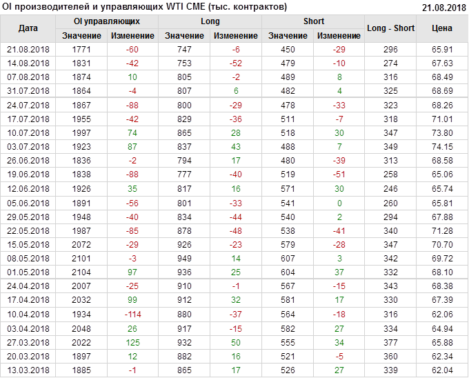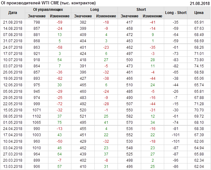 За прошлую неделю, 13.08.18 — 17.08.18, разница между длинными и короткими позициями производителей и управляющих выросла на 23 тыс. контрактов. За отчетный период времени, цена упала на 1.72 доллара. Производители и управляющие в своей совокупности смотрели вверх, не смотря на то, что цена продолжала снижаться. Подобный дисбаланс должен привести к стабилизации и развороту цен вверх в скором времени.