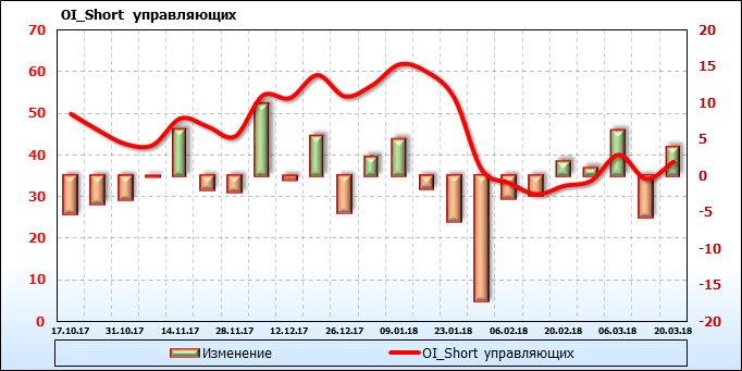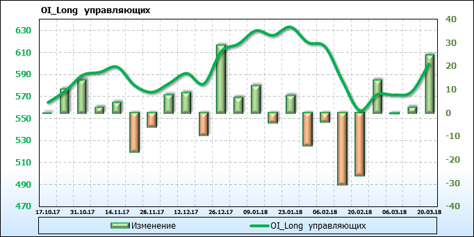 Открытый интерес управляющих активами без учета объема торговцев занимающих противоположные позиции по фьючерсным контрактам с разной датой экспирации вырос на 27 тысяч контрактов. Объем контрактов, направленных на спекуляции, составляет 857514 штук. Деньги управляющих в течение прошлой недели приходили на рынок поддерживая тенденцию.