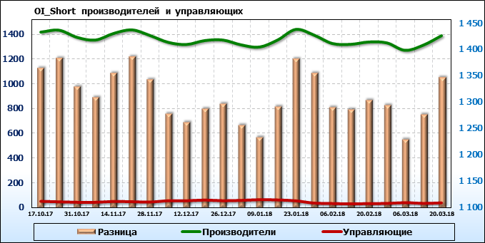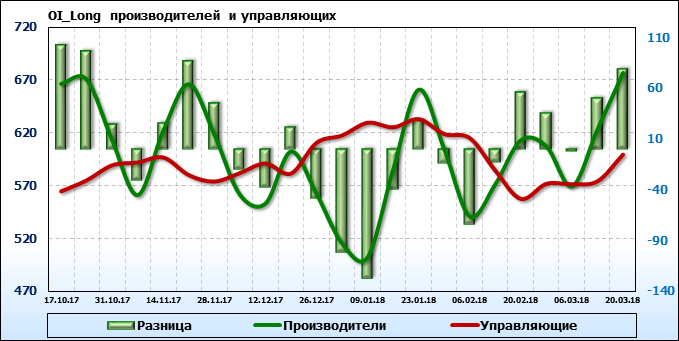 За прошедшую неделю разница между OI производителей и OI управляющих выросла на 101809 контрактов. Разница между длинными позициями производителей и управляющих выросла на 28713 контрактов. Разница между короткими позициями производителей и управляющих выросла на 71114 контрактов.