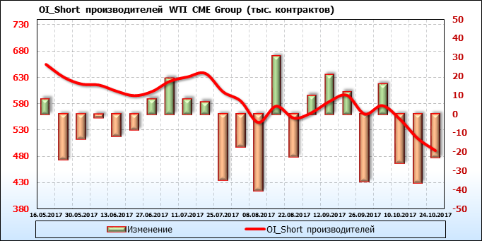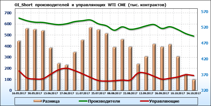 За прошедшую неделю разница между OI производителей и OI управляющих сократилась на 27 689 контрактов. Разница между длинными позициями производителей и управляющих сократилась на 32 765 контрактов. Разница между короткими позициями производителей и управляющих сократилась на 16 304 контрактов.