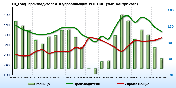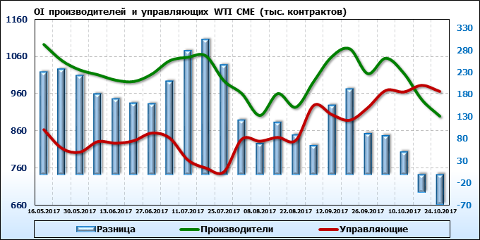 За прошедшую неделю разница между OI производителей и OI управляющих сократилась на 27 689 контрактов. Разница между длинными позициями производителей и управляющих сократилась на 32 765 контрактов. Разница между короткими позициями производителей и управляющих сократилась на 16 304 контрактов.