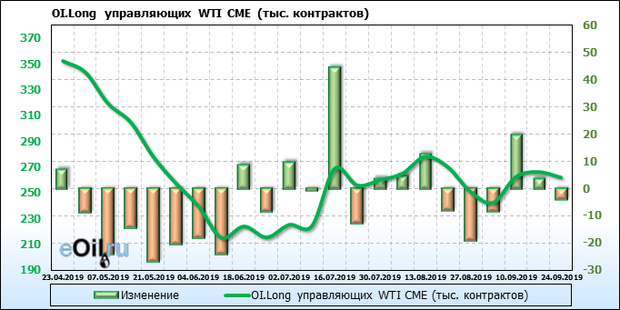 За прошлую неделю, 18.09.19 — 24.09.19, разница между длинными и короткими позициями производителей и управляющих упала на 16 тыс. контрактов. За отчетный период времени, цена упала на 2.14 доллара. Производители и управляющие на отчетной недели были склонны продавать. Суммарное число шортов было выше суммарного числа лонгов. Цены также снижаются, что создает привлекательные условия для продавцов в среднесрочной перспективе, одна — две недели.