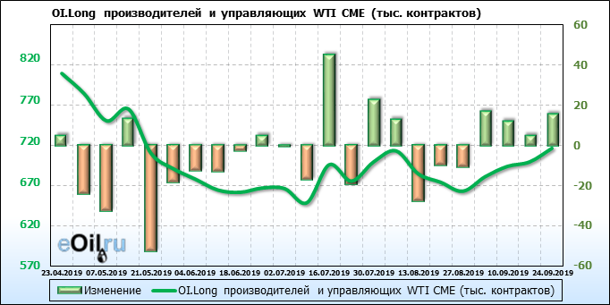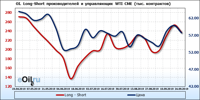 За прошлую неделю, 18.09.19 — 24.09.19, разница между длинными и короткими позициями производителей выросла на 2 тыс. контрактов. В тоже время, цена упала на 2.14 доллара. Производители перестали наращивать короткие позиции, что говорит или о непривлекательности текущих ценовых уровней для хеджирования, или о том, что часть участников рынка заняла выжидательную позицию.