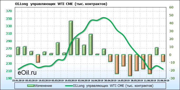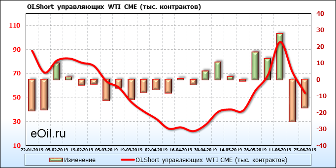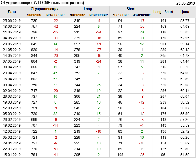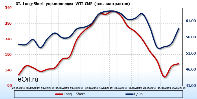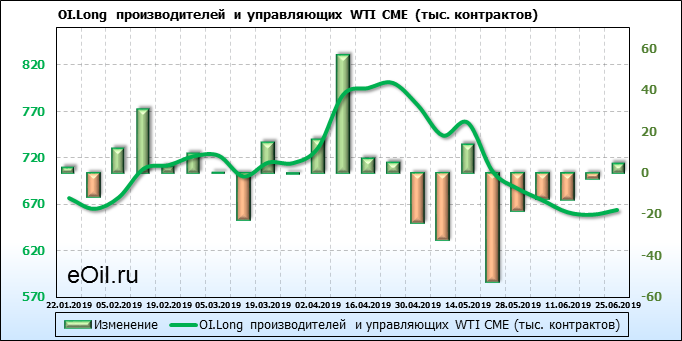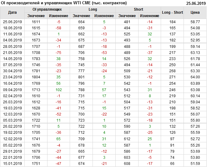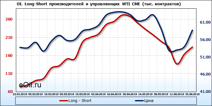 За прошлую неделю, 19.06.19 — 25.06.19, разница между длинными и короткими позициями управляющих выросла на 9 тыс. контрактов. В тоже время, цена выросла на 4.69 доллара. Управляющие наращивают позиции, разгоняя тем самым рост цен, что говорит нам о текущей силе рынка.