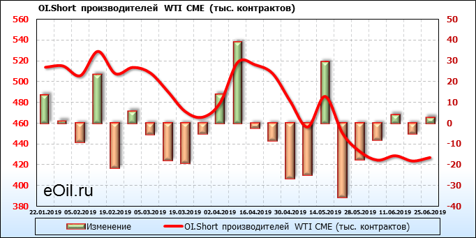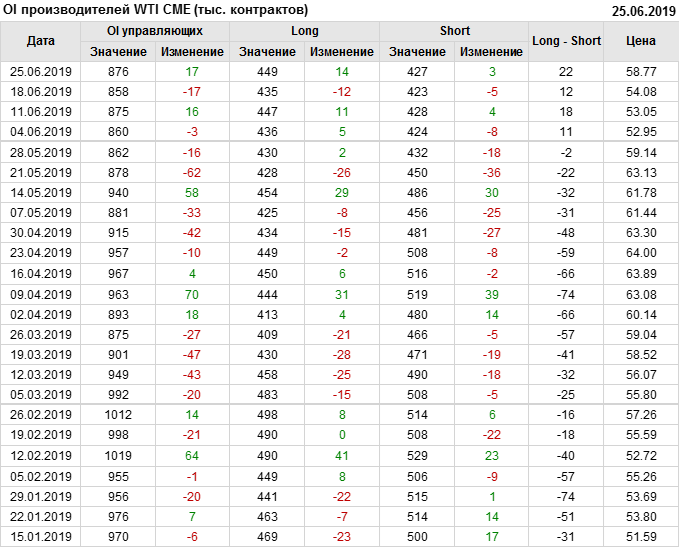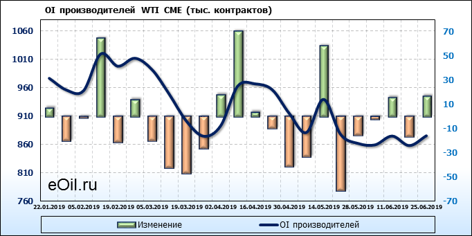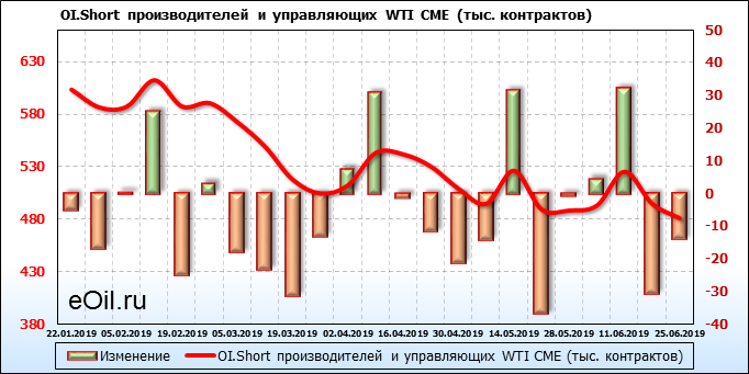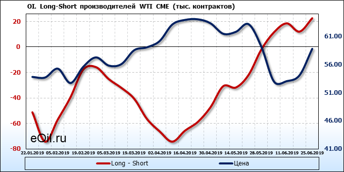 За прошлую неделю, 19.06.19 — 25.06.19, разница между длинными и короткими позициями производителей выросла на 11 тыс. контрактов. В тоже время, цена выросла на 4.69 доллара. Производители не торопятся наращивать продажи, предполагая, что возможен рост цены в ближайшее время.