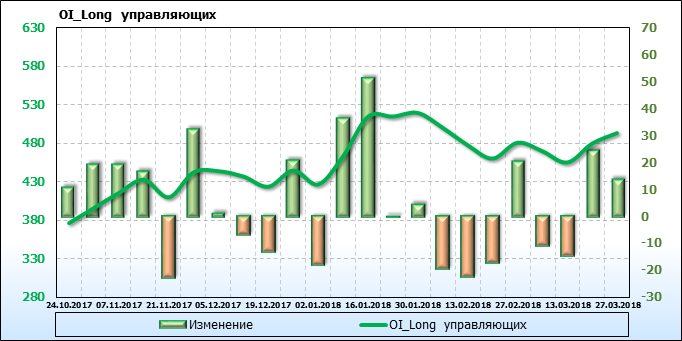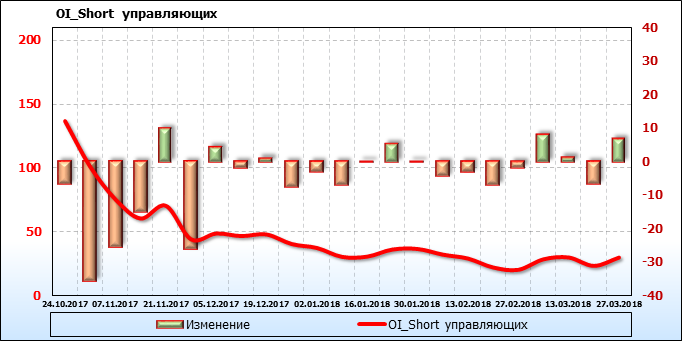 Открытый интерес управляющих активами без учета объема торговцев занимающих противоположные позиции по фьючерсным контрактам с разной датой экспирации вырос на 61 тысяч контрактов. Объем контрактов, направленных как правило на спекуляции, составляет 1058428 штук. Деньги управляющих в течение прошлой недели приходили на рынок поддерживая тенденцию.