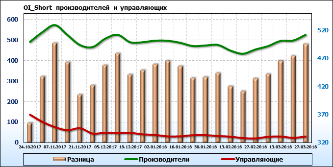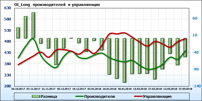 За прошедшую неделю разница между OI производителей и OI управляющих выросла на 2880 контрактов. Разница между длинными позициями производителей и управляющих выросла на 23054 контрактов. Разница между короткими позициями производителей и управляющих выросла на 20816 контрактов.