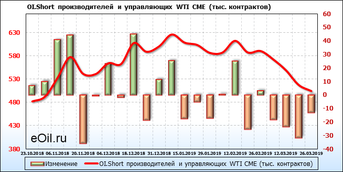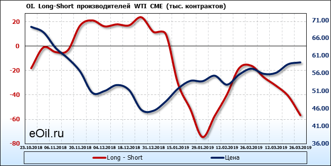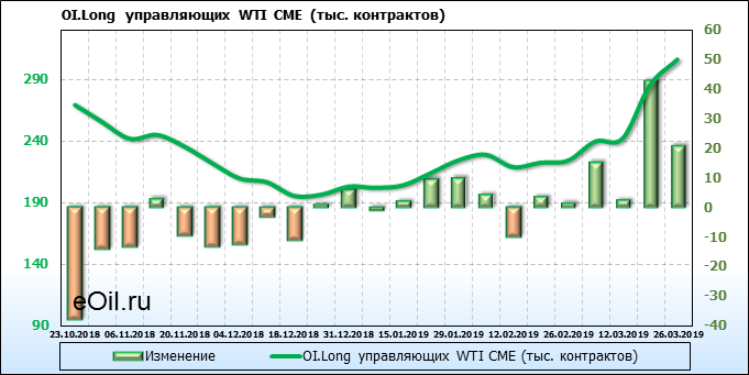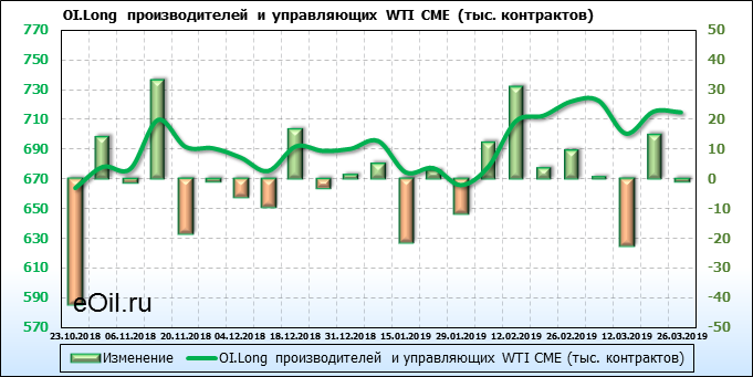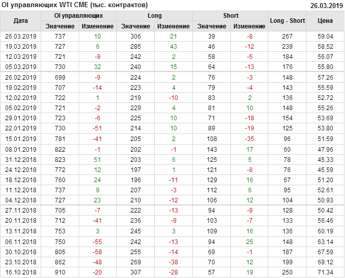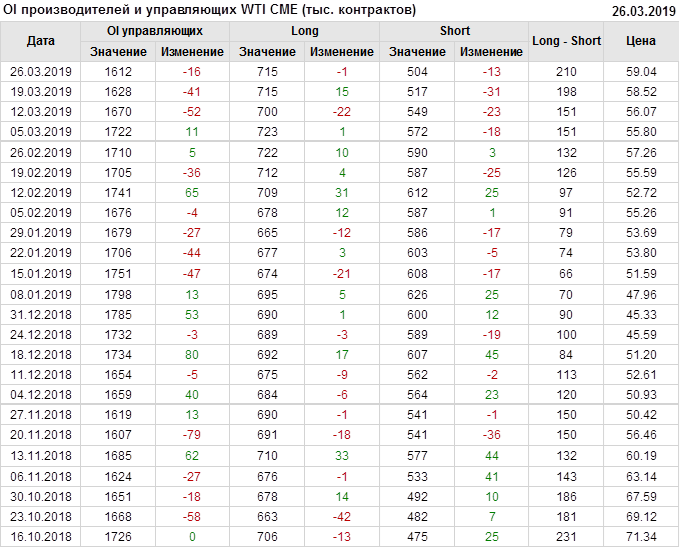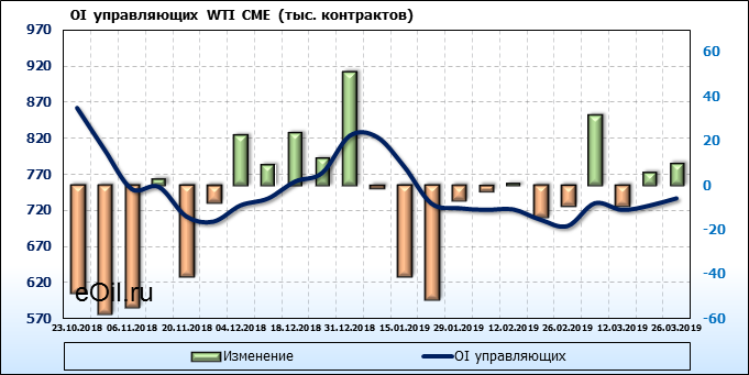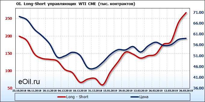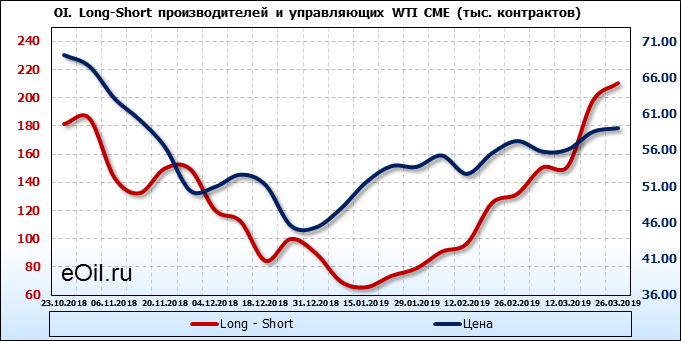 За прошлую неделю, 20.03.19 — 26.03.19, разница между длинными и короткими позициями управляющих выросла на 28 тыс. контрактов. В тоже время, цена выросла на 0.52 доллара. Управляющие наращивают позиции, разгоняя тем самым рост цен, что говорит нам о текущей силе рынка.