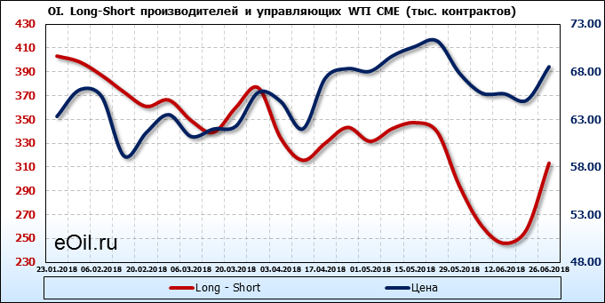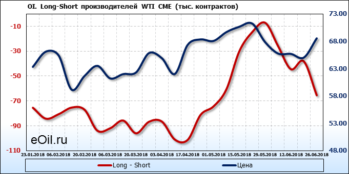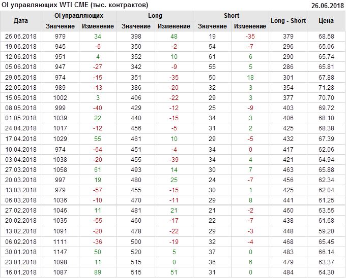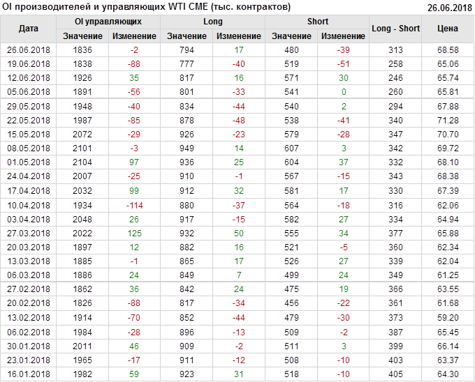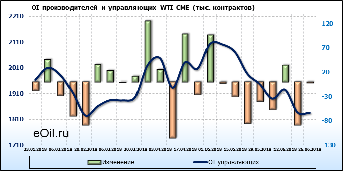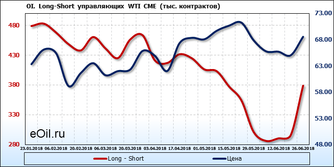 За прошлую неделю, 18.06.18 — 22.06.18, разница между длинными и короткими позициями управляющих выросла на 83 тыс. контрактов. В тоже время, цена выросла на 3.52 доллара. Управляющие наращивают позиции, разгоняя тем самым рост цен, что говорит нам о текущей силе рынка.