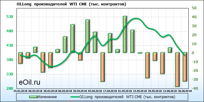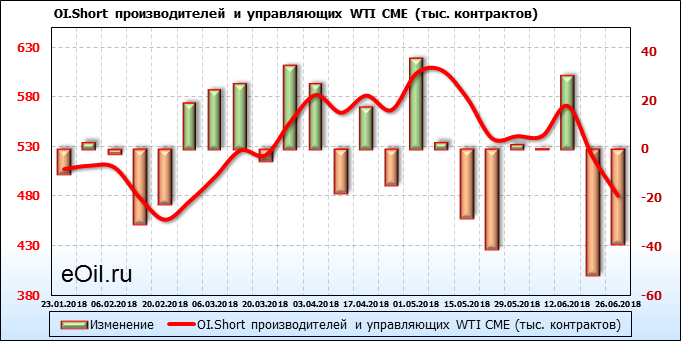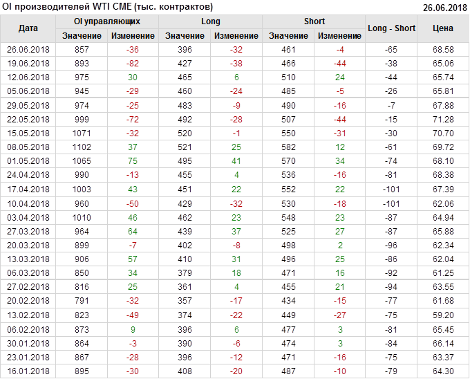За прошлую неделю, 18.06.18 — 22.06.18, разница между длинными и короткими позициями производителей упала на 27 тыс. контрактов. В тоже время, цена выросла на 3.52 доллара. Производители увеличивают продажи, предполагая, что текущие уровни являются привлекательными для них. И не смотря на это, рынок продолжает расти, что показывает силу текущего тренда.