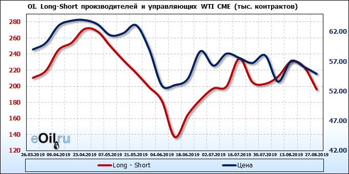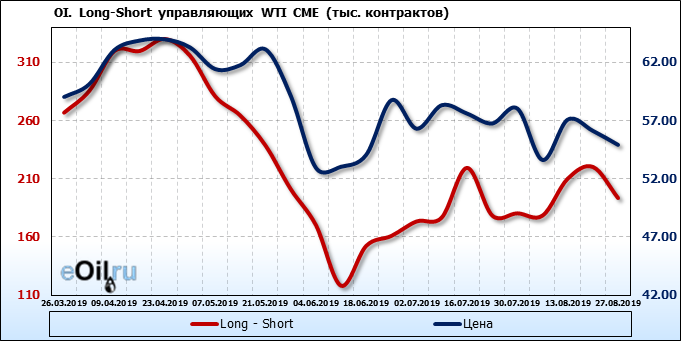 За прошлую неделю, 21.08.19 — 27.08.19, разница между длинными и короткими позициями управляющих упала на 27 тыс. контрактов. В тоже время, цена упала на 1.2 доллара. Наращивание коротких позиций спекулянтами приводит к падению цен. Если давление со стороны медведей продолжится, то мы можем увидеть новые минимумы.