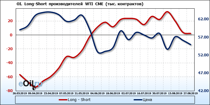 За прошлую неделю, 21.08.19 — 27.08.19, разница между длинными и короткими позициями производителей упала на 2 тыс. контрактов. В тоже время, цена упала на 1.2 доллара. Производители наращивают короткие позиции, что не дает цене расти. В такой ситуации на рынке возможно ускорение падения цен.
