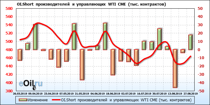 За прошлую неделю, 21.08.19 — 27.08.19, разница между длинными и короткими позициями производителей и управляющих упала на 28 тыс. контрактов. За отчетный период времени, цена упала на 1.2 доллара. Производители и управляющие на отчетной недели были склонны продавать. Суммарное число шортов было выше суммарного числа лонгов. Цены также снижаются, что создает привлекательные условия для продавцов в среднесрочной перспективе, одна — две недели.