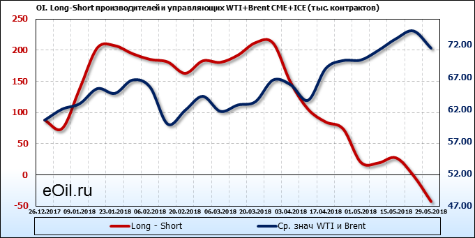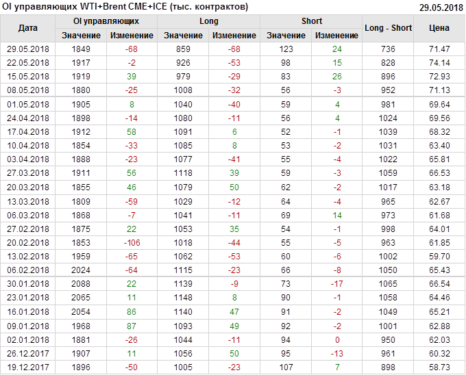 За прошлую неделю, 21.05.18 — 25.05.18, разница между длинными и короткими позициями управляющих упала на 92 тыс. контрактов. В тоже время, цена упала на 2.67 доллара. Наращивание коротких позиций спекулянтами приводит к падению цен. Если давление со стороны медведей продолжится, то мы можем увидеть новые минимумы.