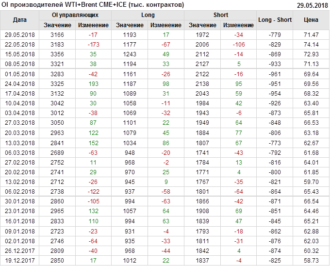 За прошлую неделю, 21.05.18 — 25.05.18, разница между длинными и короткими позициями производителей и управляющих упала на 42 тыс. контрактов. За отчетный период времени, цена упала на 2.67 доллара. Производители и управляющие на отчетной недели были склонны продавать. Суммарное число шортов было выше суммарного числа лонгов. Цены также снижаются, что создает привлекательные условия для продавцов в среднесрочной перспективе, одна — две недели.