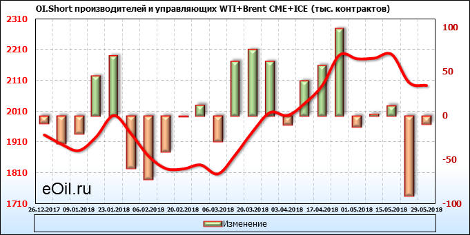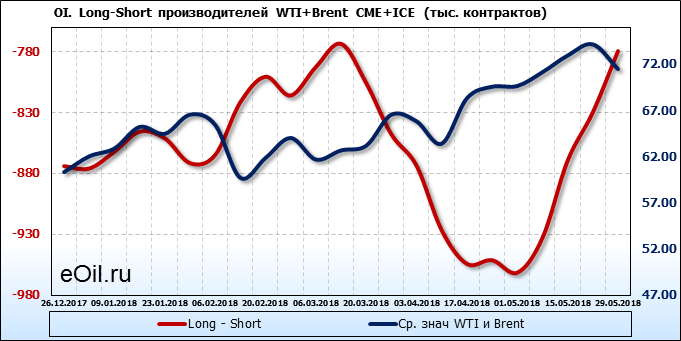 За прошлую неделю, 21.05.18 — 25.05.18, разница между длинными и короткими позициями производителей выросла на 50 тыс. контрактов. В тоже время, цена упала на 2.67 доллара. Производители перестали наращивать короткие позиции, что говорит или о непривлекательности текущих ценовых уровней для хеджирования, или о том, что часть участников рынка заняла выжидательную позицию.