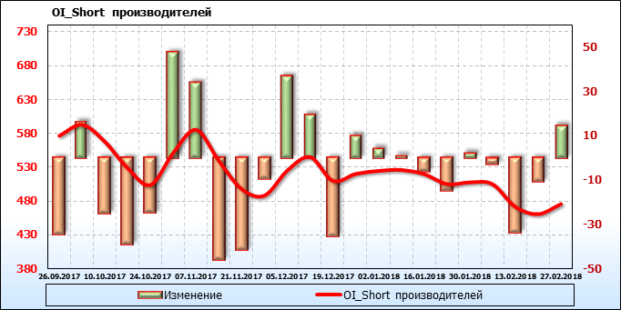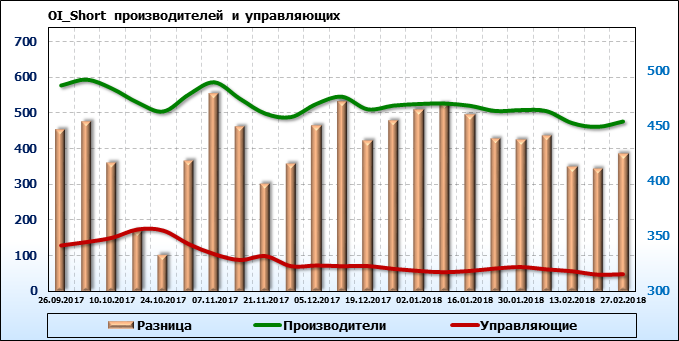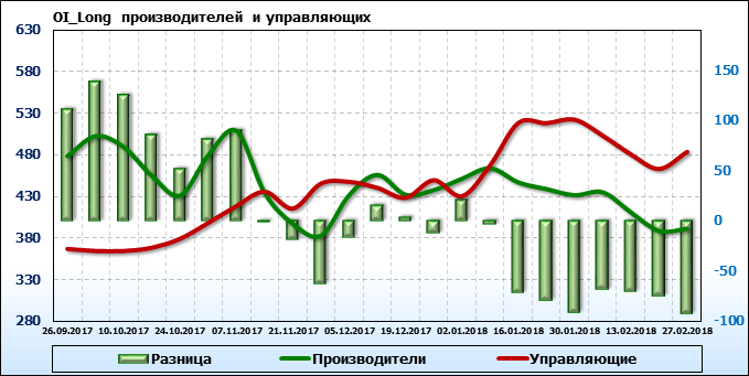 За прошедшую неделю разница между OI производителей и OI управляющих выросла на 4 361 контракт. Разница между длинными позициями производителей и управляющих сократилась на 17 646 контрактов. Разница между короткими позициями производителей и управляющих выросла на 13 914 контрактов.