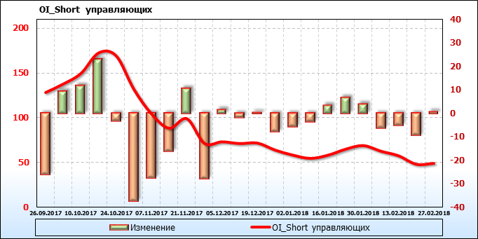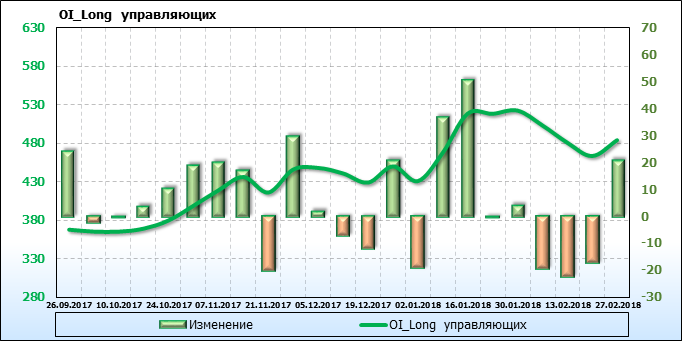 Открытый интерес управляющих активами без учета объема торговцев занимающих противоположные позиции по фьючерсным контрактам с разной датой экспирации вырос на 14 тысяч контрактов. Объем контрактов, направленных как правило на спекуляции, составляет 1 087 342 штуки. Деньги управляющих в течение прошлой недели приходили на рынок поддерживая тенденцию.