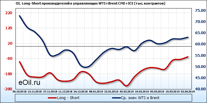 За прошлую неделю, 27.03.19 — 02.04.19, разница между длинными и короткими позициями управляющих выросла на 52 тыс. контрактов. В тоже время, цена выросла на 0.77 доллара. Управляющие наращивают позиции, разгоняя тем самым рост цен, что говорит нам о текущей силе рынка.