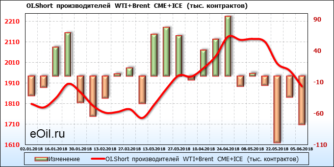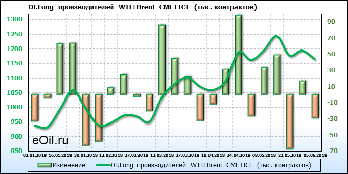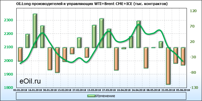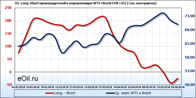 За прошлую неделю, 28.05.18 — 01.06.18, разница между длинными и короткими позициями производителей выросла на 48 тыс. контрактов. В тоже время, цена упала на 1.44 доллара. Производители перестали наращивать короткие позиции, что говорит или о непривлекательности текущих ценовых уровней для хеджирования, или о том, что часть участников рынка заняла выжидательную позицию.