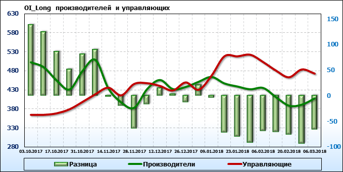 За прошедшую неделю разница между OI производителей и OI управляющих выросла на 44 355 контрактов. Разница между длинными позициями производителей и управляющих выросла на 27 262 контракта. Разница между короткими позициями производителей и управляющих выросла на 11 881 контракт.
