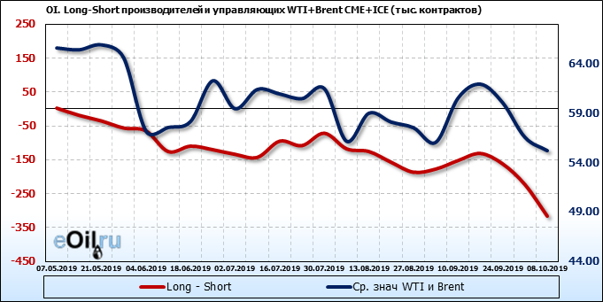 За прошлую неделю, 02.10.19 — 08.10.19, разница между длинными и короткими позициями управляющих упала на 95 тыс. контрактов. В тоже время, цена упала на 1.34 доллара. Наращивание коротких позиций спекулянтами приводит к падению цен. Если давление со стороны медведей продолжится, то мы можем увидеть новые минимумы.