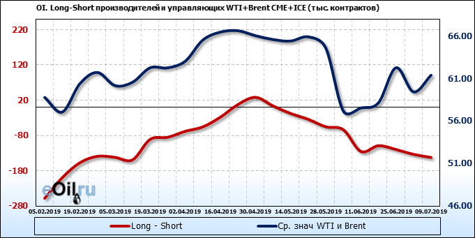 За прошлую неделю, 03.07.19 — 09.07.19, разница между длинными и короткими позициями производителей и управляющих упала на 9 тыс. контрактов. За отчетный период времени, цена выросла на 1.96 доллара. Разница совокупного объема длинных и коротких позиций производителей и управляющих на прошедшей неделе снизилась, в то время как цены выросли. Рынок теряет доверие покупателей, что, при продолжении данной динамики, приведет к стабилизации или падению цен в ближайшее время.