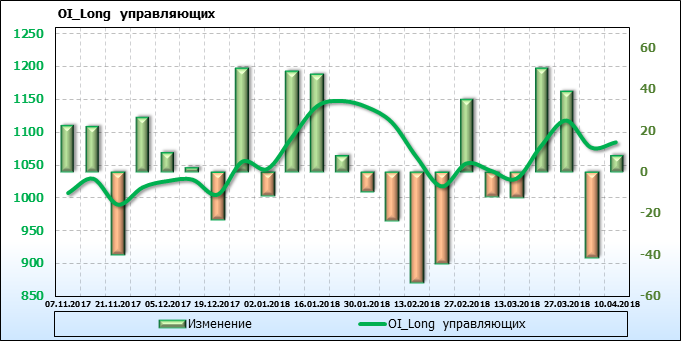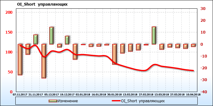 Открытый интерес управляющих активами без учета объема торговцев занимающих противоположные позиции по фьючерсным контрактам с разной датой экспирации упал на 33 тыс. контрактов. Объем контрактов, направленных на спекуляции, составляет 1 854 338 штук. Деньги управляющих в течение прошлой недели уходили с рынка не видя привлекательности в текущей ситуации.