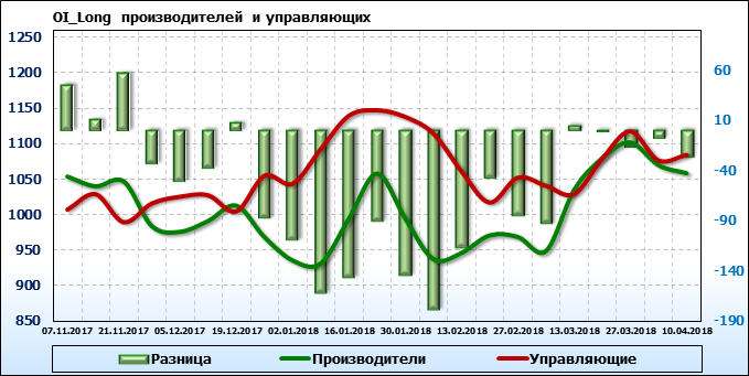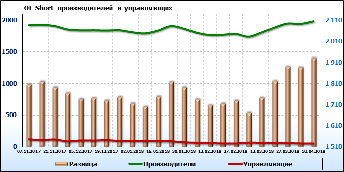 За прошедшую неделю разница между OI производителей и OI управляющих выросла на 63 660 контрактов. Разница между длинными позициями производителей и управляющих сократилась на 19 278 контрактов. Разница между короткими позициями производителей и управляющих выросла на 43 849 контрактов.