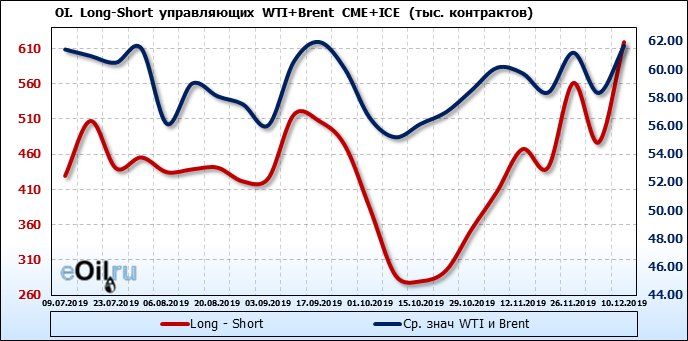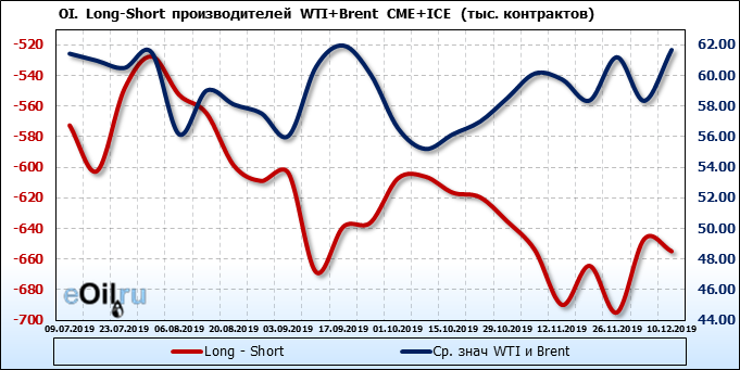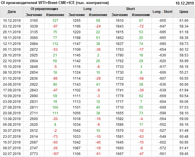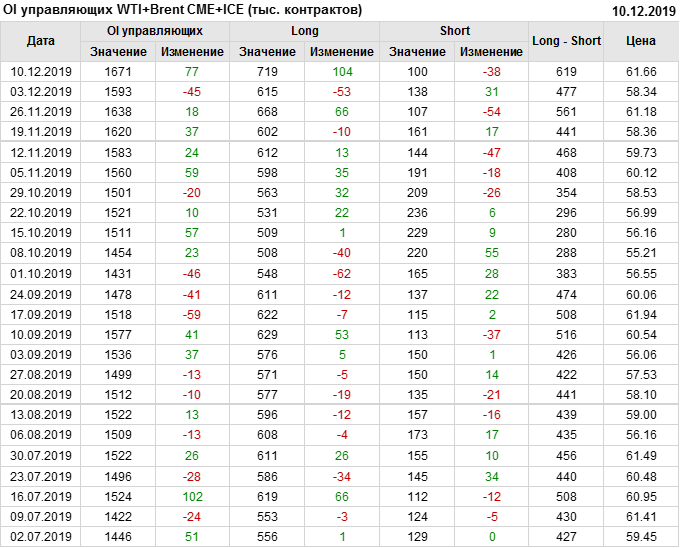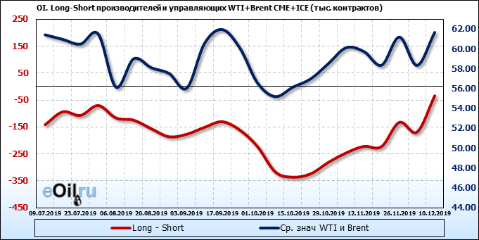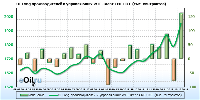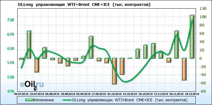 За прошлую неделю, 04.12.19 — 10.12.19, разница между длинными и короткими позициями управляющих выросла на 142 тыс. контрактов. В тоже время, цена выросла на 3.32 доллара. Управляющие наращивают позиции, разгоняя тем самым рост цен, что говорит нам о текущей силе рынка.