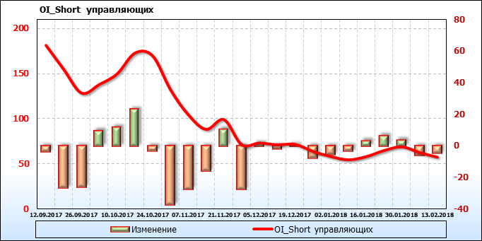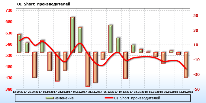 За прошедшую неделю разница между OI производителей и OI управляющих сократилась на 37 449 контрактов. Разница между длинными позициями производителей и управляющих сократилась на 1 450 контрактов. Разница между короткими позициями производителей и управляющих сократилась на 28 761 контракт.