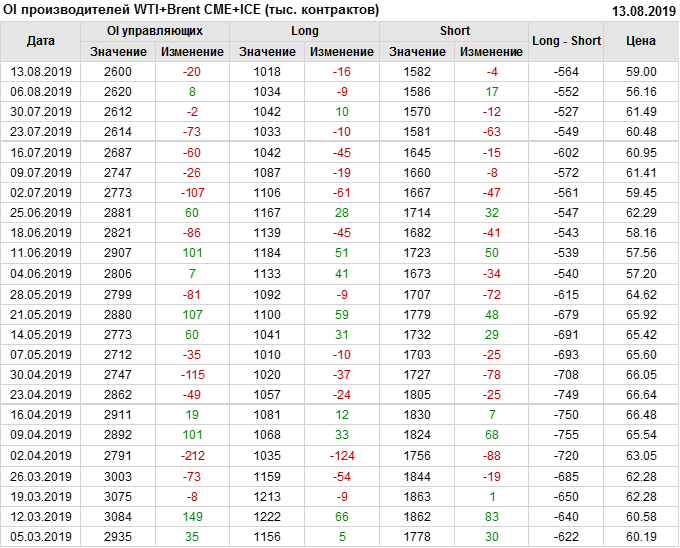 За прошлую неделю, 07.08.19 — 13.08.19, разница между длинными и короткими позициями производителей и управляющих упала на 8 тыс. контрактов. За отчетный период времени, цена выросла на 2.84 доллара. Разница совокупного объема длинных и коротких позиций производителей и управляющих на прошедшей неделе снизилась, в то время как цены выросли. Рынок теряет доверие покупателей, что, при продолжении данной динамики, приведет к стабилизации или падению цен в ближайшее время.