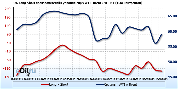 За прошлую неделю, 07.08.19 — 13.08.19, разница между длинными и короткими позициями управляющих выросла на 4 тыс. контрактов. В тоже время, цена выросла на 2.84 доллара. Управляющие наращивают позиции, разгоняя тем самым рост цен, что говорит нам о текущей силе рынка.