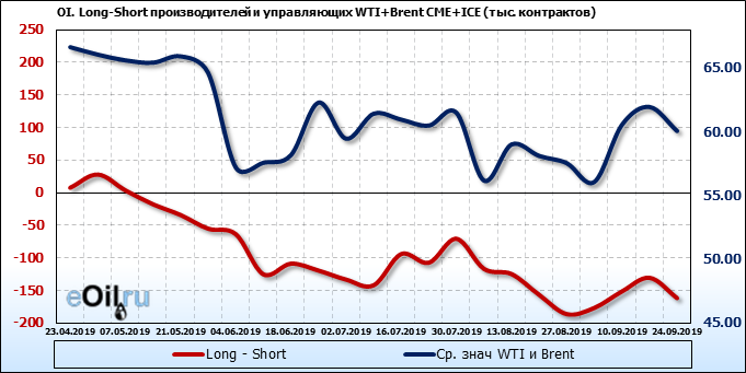 За прошлую неделю, 18.09.19 — 24.09.19, разница между длинными и короткими позициями производителей выросла на 3 тыс. контрактов. В тоже время, цена упала на 1.88 доллара. Производители перестали наращивать короткие позиции, что говорит или о непривлекательности текущих ценовых уровней для хеджирования, или о том, что часть участников рынка заняла выжидательную позицию.