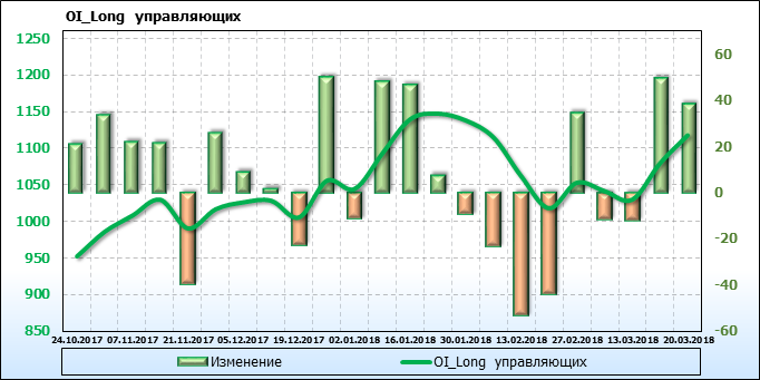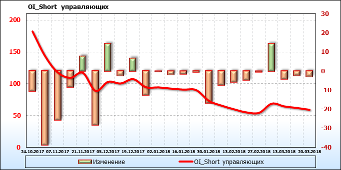 Открытый интерес управляющих активами без учета объема торговцев занимающих противоположные позиции по фьючерсным контрактам с разной датой экспирации вырос на 56 тысяч контрактов. Объем контрактов, направленных как правило на спекуляции, составляет 1911058 штук. Деньги управляющих в течение прошлой недели приходили на рынок поддерживая тенденцию.