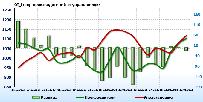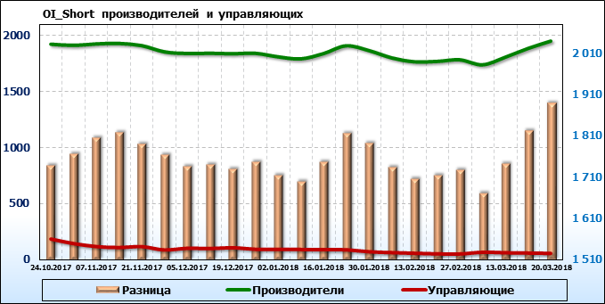 За прошедшую неделю разница между OI производителей и OI управляющих выросла на 30538 контрактов. Разница между длинными позициями производителей и управляющих сократилась на 16567 контрактов. Разница между короткими позициями производителей и управляющих выросла на 67497 контрактов.