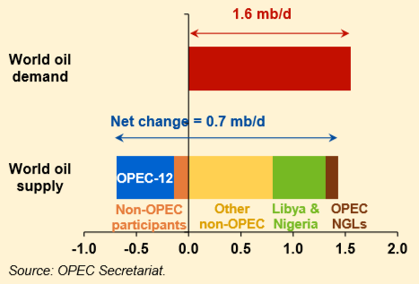 В течение первых трех кварталов 2017 года ОПЕК-12 сократила среднее производство на 0,6 мб/д, участники, не входящие в ОПЕК, на 0,2 мб/д по сравнению с аналогичным периодом прошлого года, в то время как предложение стран, не входящих в ОПЕК, увеличилось на 0,9 мб/д.