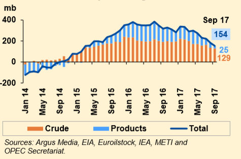 В результате, запасы ОЭСР упали на 83 мб за первые три квартала этого года, по сравнению с объемом в 38 мб в такой же период прошлого года и объемом в 100 мб за предыдущие пять лет (2012-2016). За первые три квартала 2017, запасы нефти упали на 23 мб, запасы нефтепродуктов в ОЭСР упали на 60 мб, в основном из-за повышения спроса в странах ОЭСР.