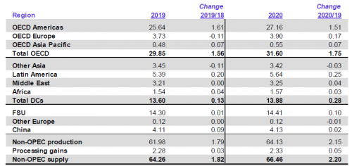 Рис. 1 Сравнение прогнозов по уровню предложения в странах, не входящих в ОПЕК, в 2019-2020 годах, млн. баррелей в день