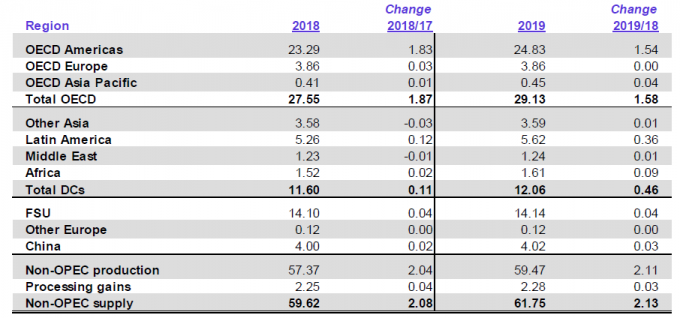Предложение в странах, не входящих в ОПЕК, в 2019 году также было пересмотрено в сторону увеличения на 106 тыс. баррелей в день до 61.75 млн. баррелей в день. Годовой прирост показателя был пересмотрен в сторону увеличения на 34 тыс. баррелей в день до 2.13 млн. баррелей в день.