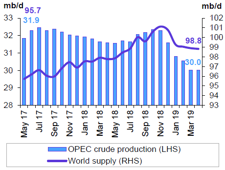 По предварительным данным, уровень предложения на мировом рынке нефти в апреле 2019 года сократился на 0.07 млн. баррелей в день до среднего значения 98.82 млн. баррелей в день. В апреле снижение показателя среди стран, не входящих в ОПЕК (включая газоконденсаты, производимые в странах ОПЕК), в объеме 0.07 млн. баррелей в день было обусловлено сокращением производительности в Казахстане, Канаде, Китае и России. Впрочем, по сравнению с предшествующим годом средний уровень предложения возрос на 1.05 млн. баррелей в день.