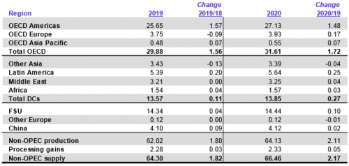 Прогноз по темпам роста предложения в странах, не входящих в ОПЕК, в 2019 году не изменился с предыдущего отчета и остался на уровне 1.82 млн баррелей в сутки при среднегодовом уровне в 64,30 млн баррелей в сутки.